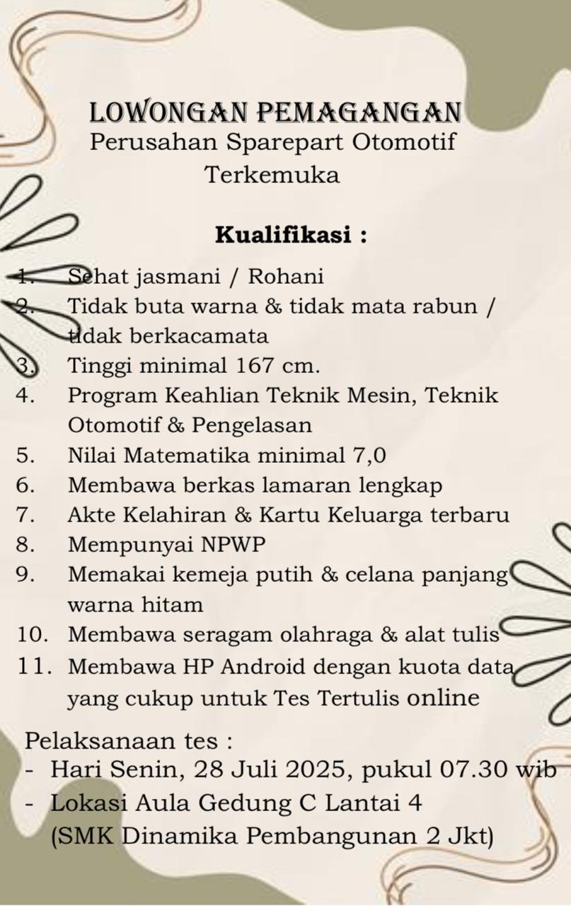 PERUSAHAAN OTOMOTIF membuka LOKER Pemagangan untuk alumni SMK Dinamika Pembangunan 1 Jakarta dan Umum.